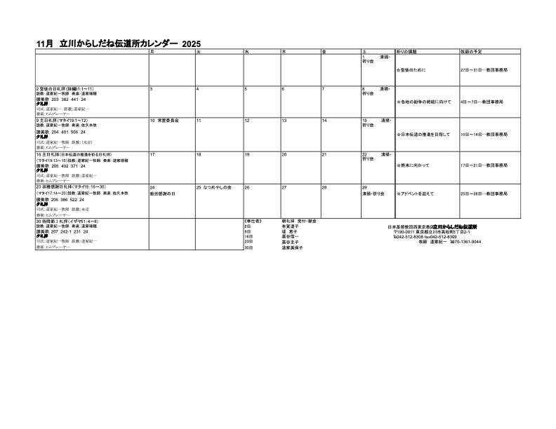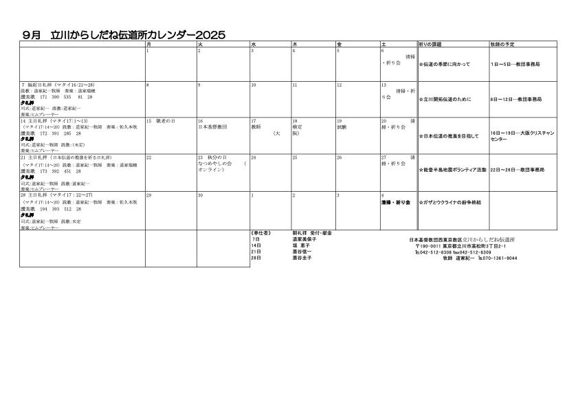また、祈禱会や聖書研究会、牧師面談日などの時間を設け、立川の地にイエス・キリストの福音を伝える場となっております。